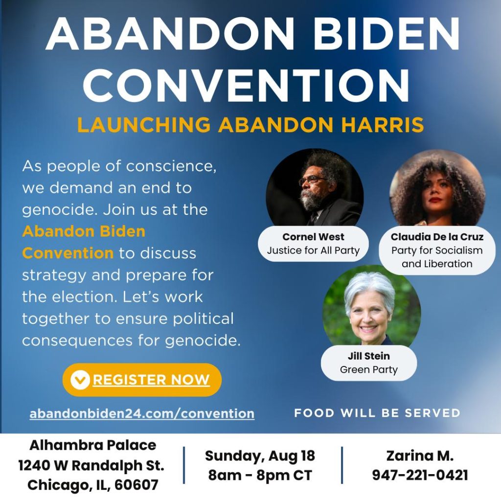 In this historic gathering, leaders and people of conscience - from all walks of life, from across the country - will come together to the Abandon Biden Convention. The goal is for leaders to come together one last time prior to the beginning of the election period to set the stage to punish Biden for his genocide. For years, people of conscience have been forced to choose between the ‘lesser evil’ platform offered by competing presidential candidates and – at this convention – we are determined to take the necessary steps to transform America, sending a signaling the power of people of conscience to the political landscape. The Abandon Biden convention seeks to be a locus for strategizing of leaders across the nations and in the swing states. We will discuss the best practices of campaigning and messaging.